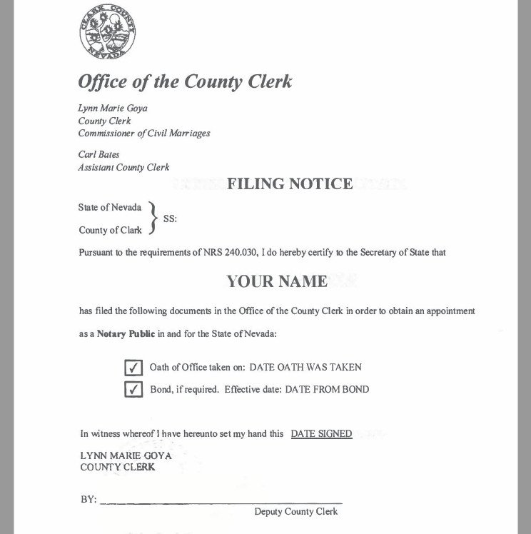 - Take a notarial oath as mandated by NRS 240.030. The notarial oath can be taken at the same time you file your Bond with the County Clerk’s office (following step).